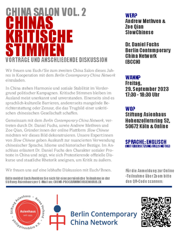 Gemeinsam mit unserem Kooperationspartner Berlin Contemporary China Network, vertreten durch Dr. Daniel Fuchs, sowie Andrew Methven und Zoe Qian, Gründer:innen der online Plattform Slow Chinese möchten wir dieses Bild dekonstruieren. Unsere Expert:innen von Slow Chinese geben Auskunft über die vielfältigen Möglichkeiten der nuancierten Anwendung chinesischer Sprache und Tradition, um Kritik zu äussern. In ihrem Podcast setzen sie sich wöchentlich mit kreativen Doppeldeutigkeiten in chinesischen Medien und digitalen Plattformen auseinander. Im Anschluss erläutert Dr. Daniel Fuchs den Charakter sozialer Proteste in China und zeigt, wie sich Protestierende offizielle Diskurse und staatliche Rhetorik aneignen, um Kritik zu äußern.
